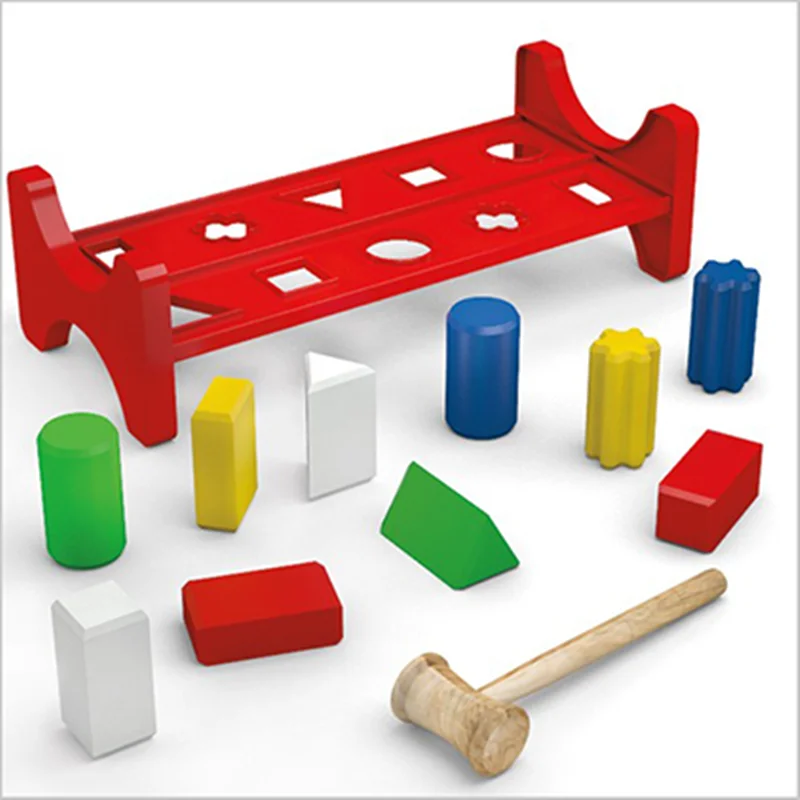 در بازی صفحه ی جاگذاری اشکال با چکش کودک در مرحله نخست باید تشخیص دهد کدام شکل را باید در کدام سوراخ قرار دهد ، در این مرحله از بازی کودک با مفهوم اشکال و اختلاف های آن ها آشنا می شود ، در مرحله بعد کودک باید با وسیله چکش اقدام به پایین راندن این اشکال در مکان مورد نظر کند ، در بازی صفحه ی جاگذاری اشکال با چکش کودک می تواند به وسیله اجسام موجود برداشتی درستی از ابعاد و فضا مورد اشغال وسیله ها داشته باشد ، همچنین در این بازی کودک مهارت دستی را به طور چشم گیری یاد می گیرد و باعث افزایش توانایی در این مهارت می شود. هنگام بازی کردن با این وسیله هماهنگی بین چشم و دست کودک برقرار می شود که این نیز یکی از اهداف آموزشی این بازی می باشد .